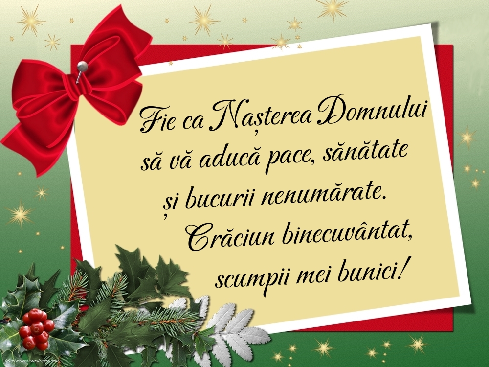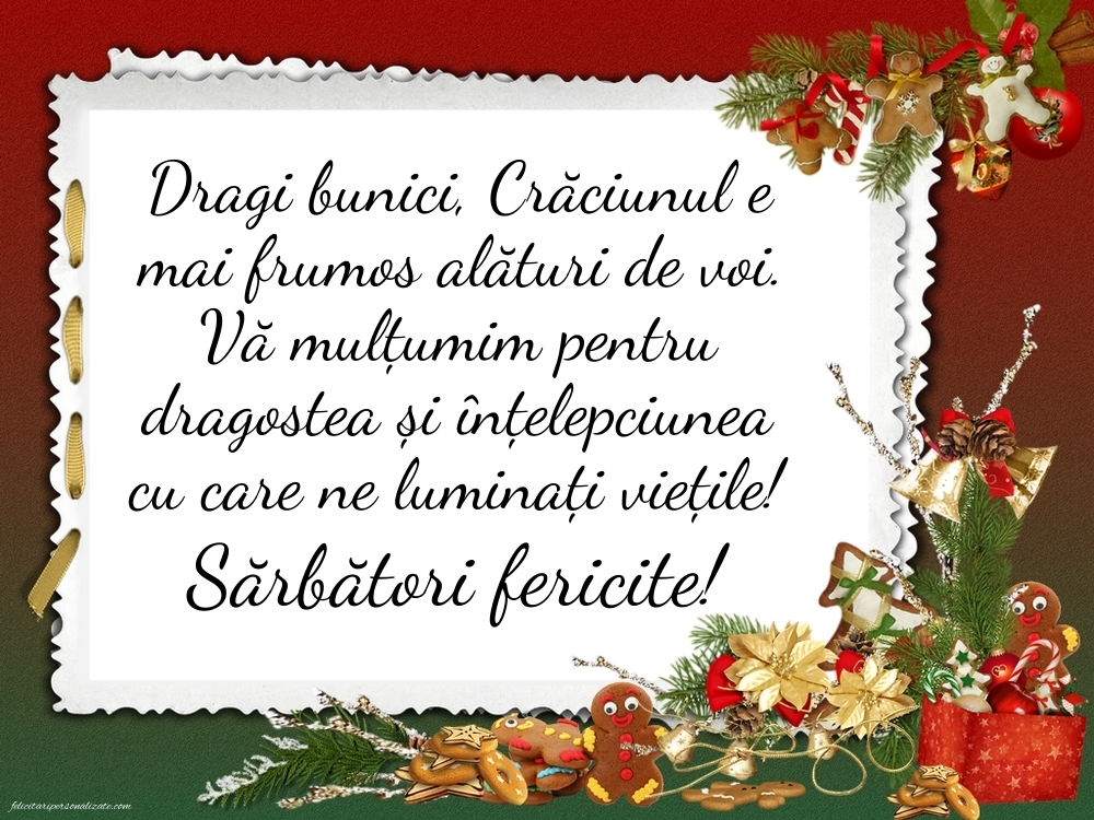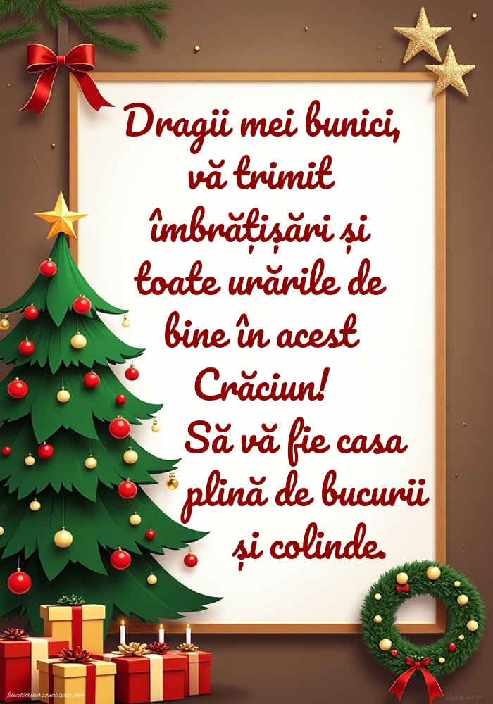 Bunicii sunt sufletul familiei, iar Crăciunul este momentul perfect pentru a le arăta cât de mult îi iubim. Am pregătit o colecție de felicitări și imagini de Crăciun pentru bunici, pline de căldură, dragoste și recunoștință. Găsești aici urări emoționante de „Crăciun Fericit”, mesaje cu teme creștine, imagini vesele cu Moș Crăciun și simboluri tradiționale de iarnă. Trimite o felicitare personalizată bunicilor tăi și adu-le un zâmbet în suflet în cea mai frumoasă perioadă a anului.