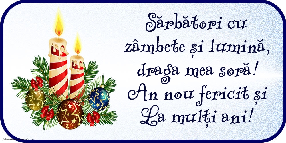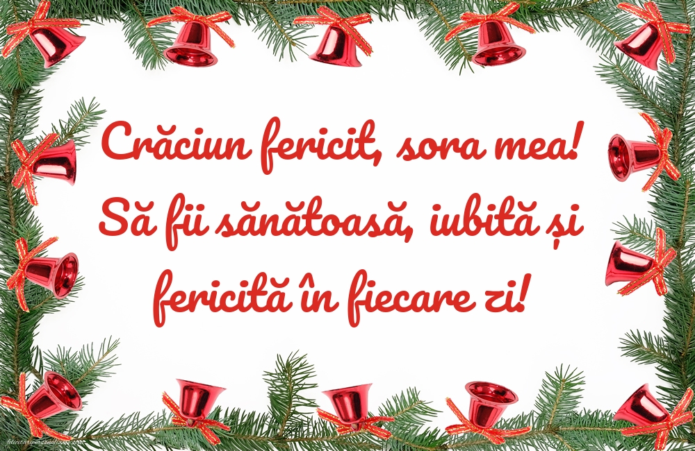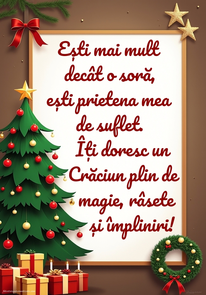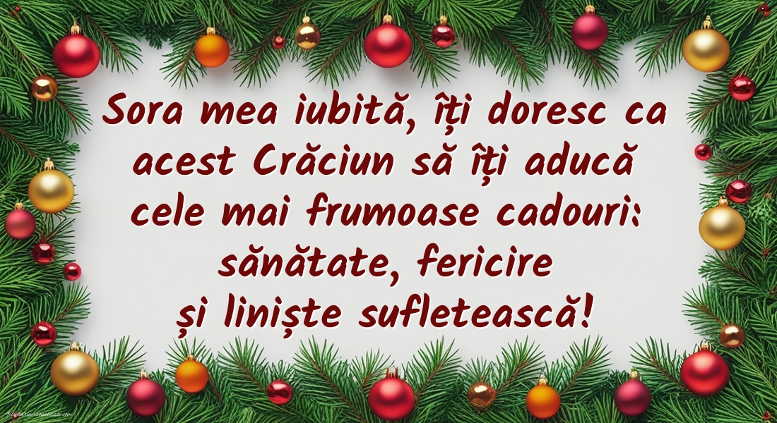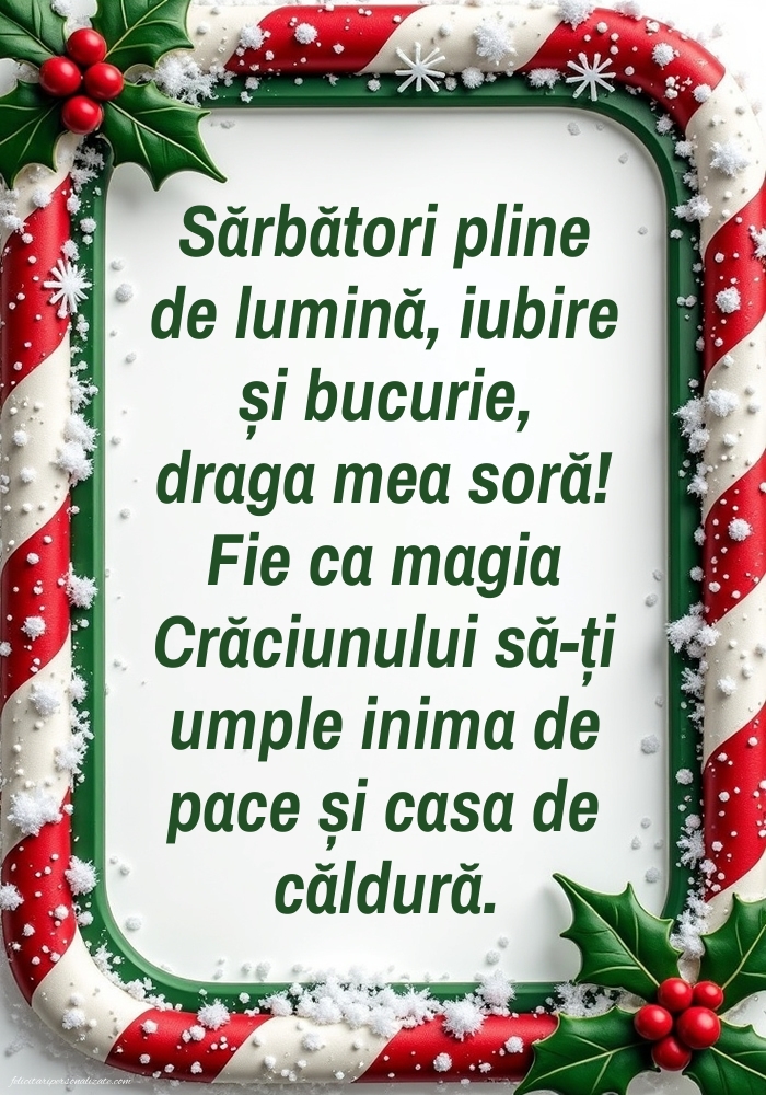 Crăciunul este momentul perfect pentru a le arăta celor dragi cât de mult îi prețuim, iar sora ta merită cele mai frumoase cuvinte și imagini. Pe această pagină vei găsi o colecție specială de imagini cu felicitări de Crăciun pentru soră ⭐, create pentru a transmite afecțiune, recunoștință și bucurie. Fie că vrei să îi trimiți o felicitare elegantă, o imagine cu un mesaj emoționant sau o urare veselă și plină de culoare, aici vei găsi inspirația perfectă. Aceste felicitări de Crăciun pentru soră sunt potrivite pentru a fi trimise prin WhatsApp, Messenger, e-mail sau postate pe Facebook și Instagram. Surprinde-ți sora cu o imagine frumoasă și un mesaj plin de iubire care să îi aducă zâmbetul pe buze și căldura în suflet. Fă ca acest Crăciun să fie unul special, plin de momente de neuitat și gânduri luminoase!