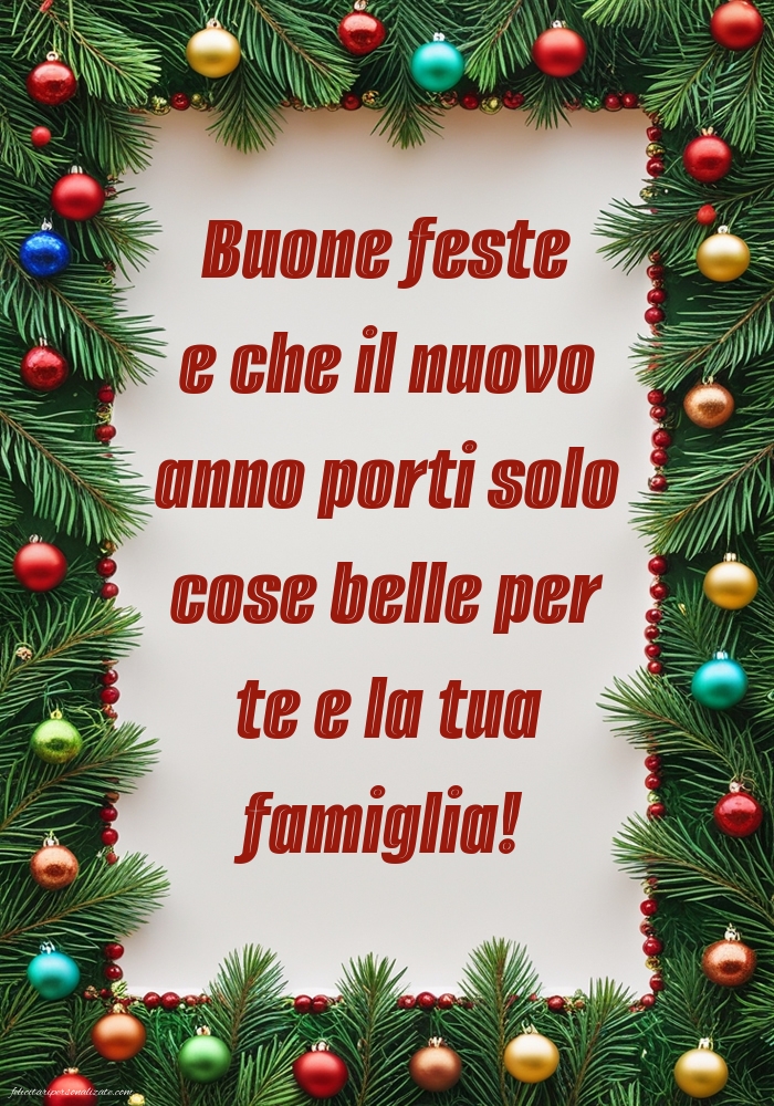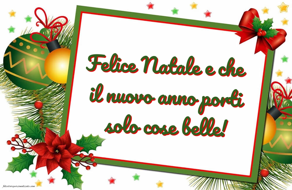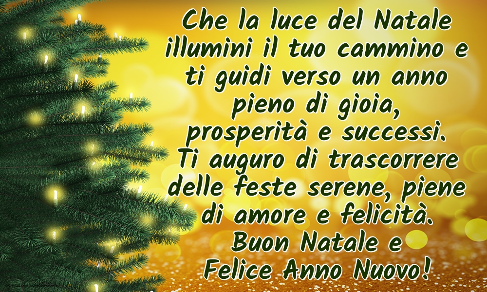 Che la luce del Natale illumini il tuo cammino e ti guidi verso un anno pieno di gioia, prosperità e successi. Ti auguro di trascorrere delle feste serene, piene di amore e felicità. Buon Natale e Felice Anno Nuovo!