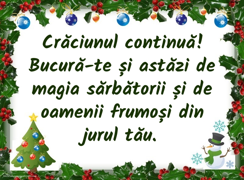 Sărbătoarea Crăciunului continuă și în cea de-a doua zi, un moment potrivit pentru a trimite gânduri bune și mesaje de bucurie. În această colecție vei descoperi imagini cu urări pentru a doua zi de Crăciun, perfecte pentru a fi distribuite pe Facebook, WhatsApp sau prin mesaje. Fiecare imagine este însoțită de texte emoționante, creștine sau vesele, care exprimă recunoștință, iubire și spiritul sărbătorilor. Alege o felicitare cu tematică de iarnă și surprinde-i pe cei dragi cu o urare plină de lumină și speranță.
