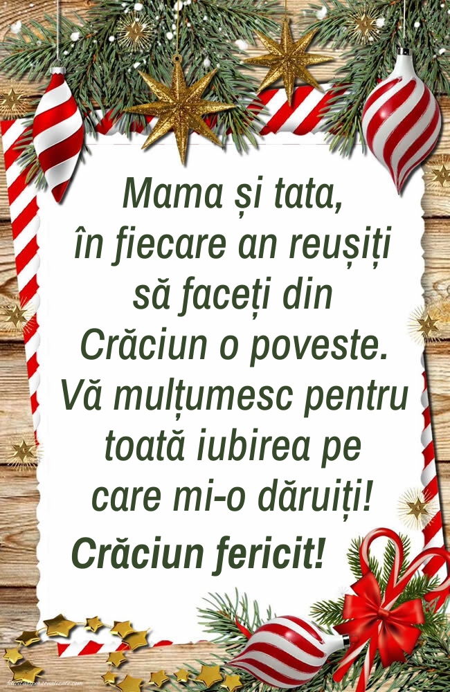 Crăciun fericit, dragii mei părinți! Mulțumesc pentru tot ce faceți și pentru că sunteți cei mai minunați părinți din lume. Să aveți sărbători liniștite și pline de bucurii!