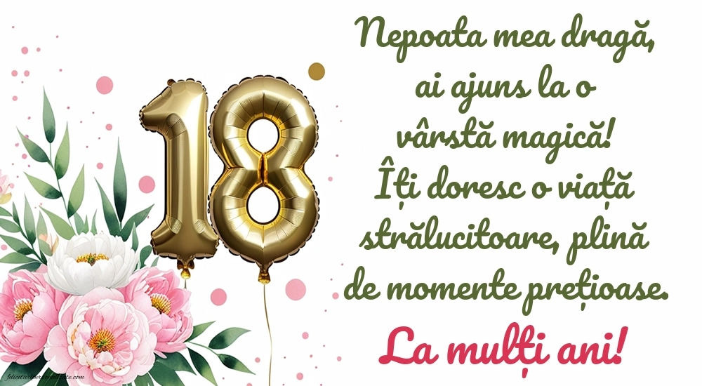 Majoratul nepoatei tale este o zi plină de emoții și bucurie, un moment ce merită să fie marcat cu urări speciale și felicitări deosebite. Pe această pagină vei găsi o selecție de imagini cu felicitări de 18 ani pentru nepoată ⭐, ideale pentru a transmite cele mai sincere și frumoase gânduri. Aceste felicitări pot fi trimise prin mesaje digitale, postate pe rețele sociale sau imprimate pentru a oferi un cadou personalizat și plin de căldură. Vei descoperi imagini cu mesaje elegante, amuzante sau inspiraționale, potrivite pentru orice relație frățească.