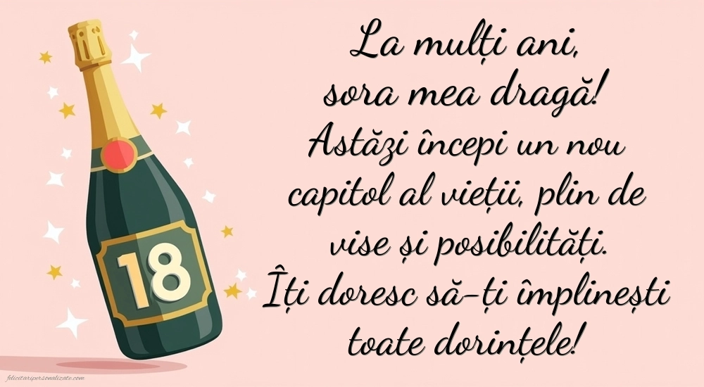 Majoratul surorii este un moment deosebit, plin de emoție și bucurie. Pentru a-i arăta cât de mult o prețuiești, îți punem la dispoziție o colecție cu imagini cu felicitări de 18 ani pentru soră ⭐, perfecte pentru a exprima cele mai sincere urări. Aceste felicitări sunt potrivite pentru a fi trimise prin mesaje, postate pe rețele sociale sau imprimate, oferindu-i surorii tale un cadou digital plin de căldură și emoție. Vei găsi texte elegante, haioase, inspiraționale sau tandre, potrivite pentru orice relație specială.