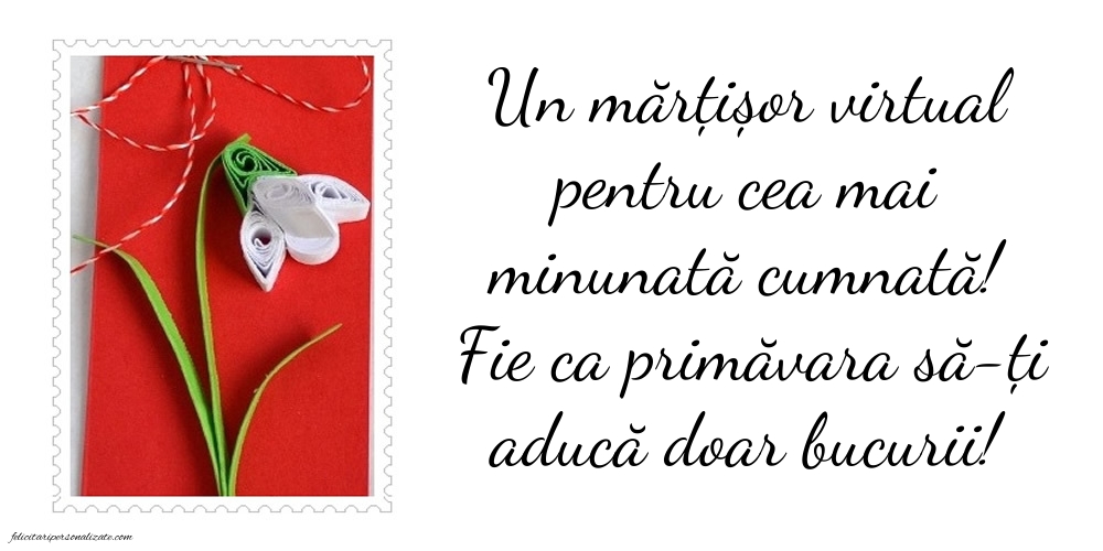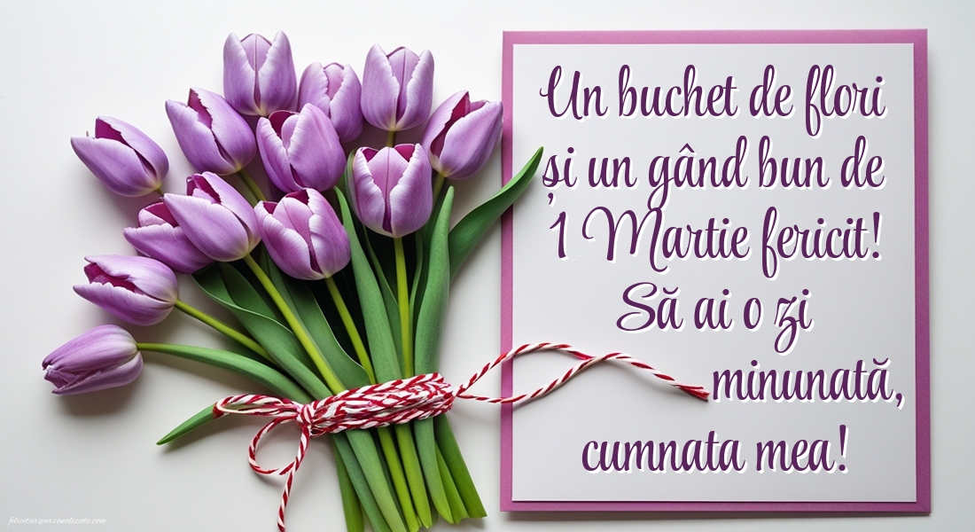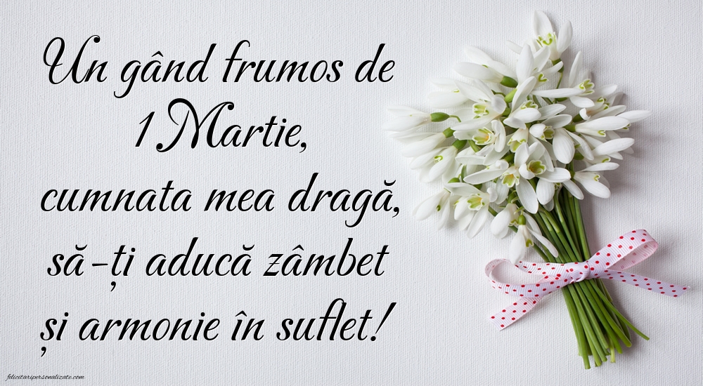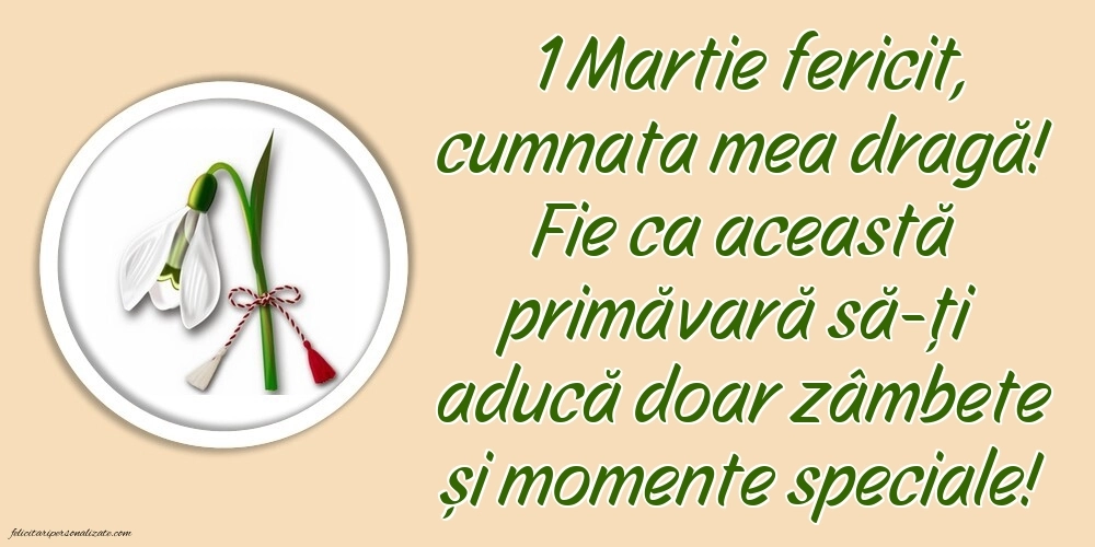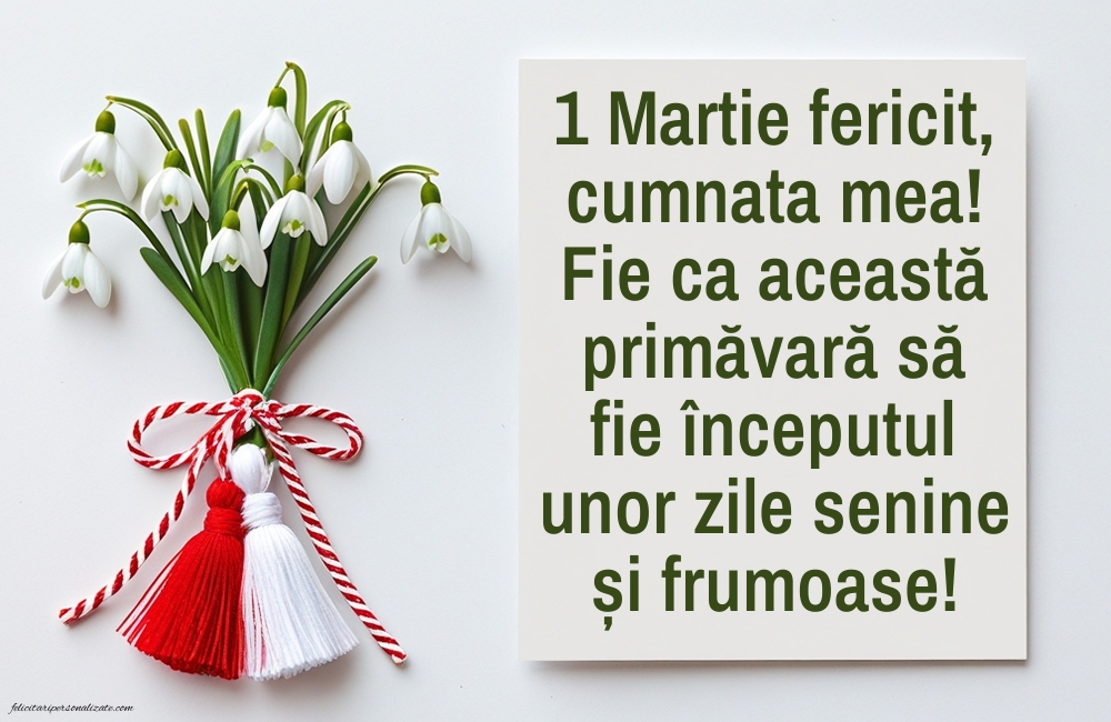 Descoperă cele mai frumoase imagini cu felicitări de 1 Martie pentru cumnată ⭐, perfecte pentru a transmite gânduri calde, apreciere și bucurie de primăvară. Aici găsești poze cu Mărțișor, felicitări cu mesaje frumoase și imagini potrivite pentru a fi trimise online sau oferite personal. Imaginile de 1 Martie pentru cumnată sunt ideale pentru a exprima respectul, prietenia și apropierea din familie, aducând zâmbete și emoție la începutul primăverii.