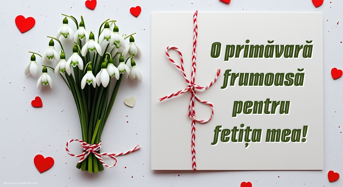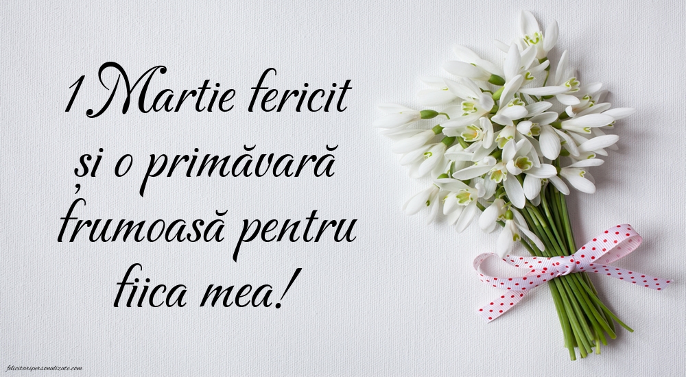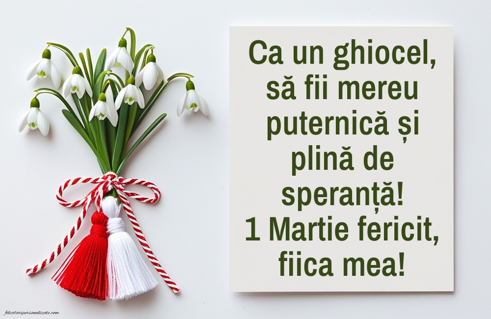 Descoperă cele mai frumoase imagini cu felicitări de 1 Martie pentru fiică ⭐, perfecte pentru a transmite dragoste, mândrie și gânduri calde de primăvară. Aici găsești poze cu Mărțișor, felicitări cu mesaje emoționante și imagini potrivite pentru a fi trimise online sau oferite personal. Imaginile de 1 Martie pentru fiică sunt ideale pentru a exprima afecțiunea, sprijinul și bucuria de a avea un copil minunat, aducând zâmbete și emoție la începutul primăverii.