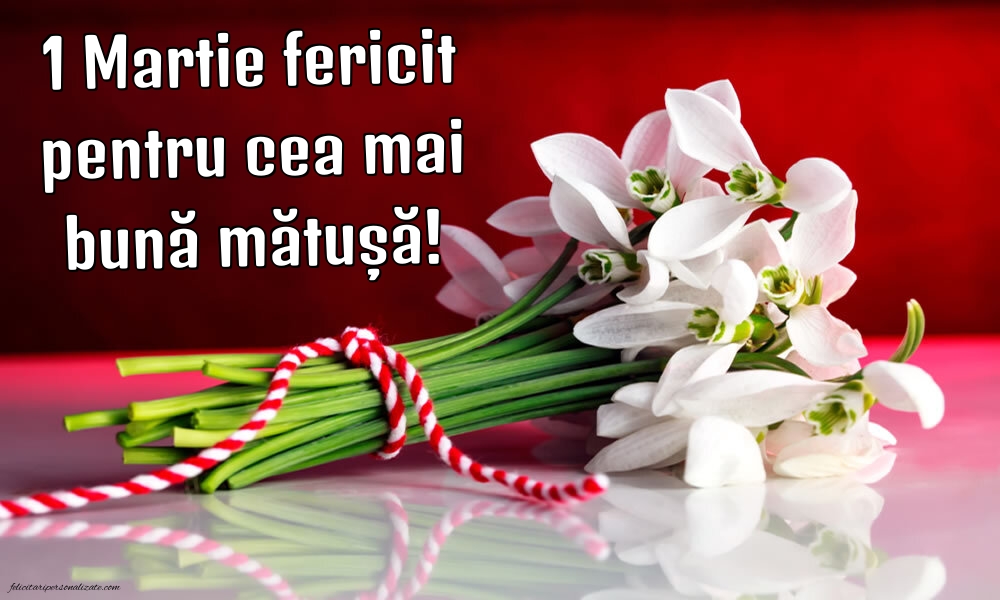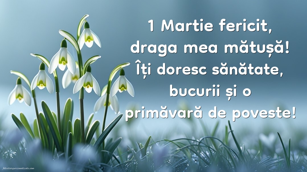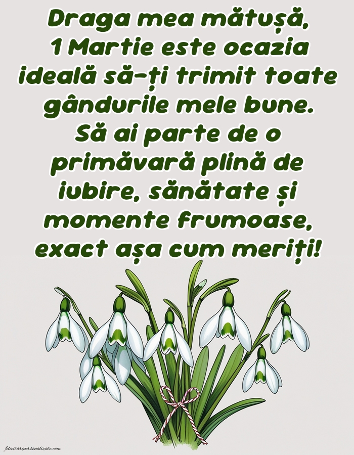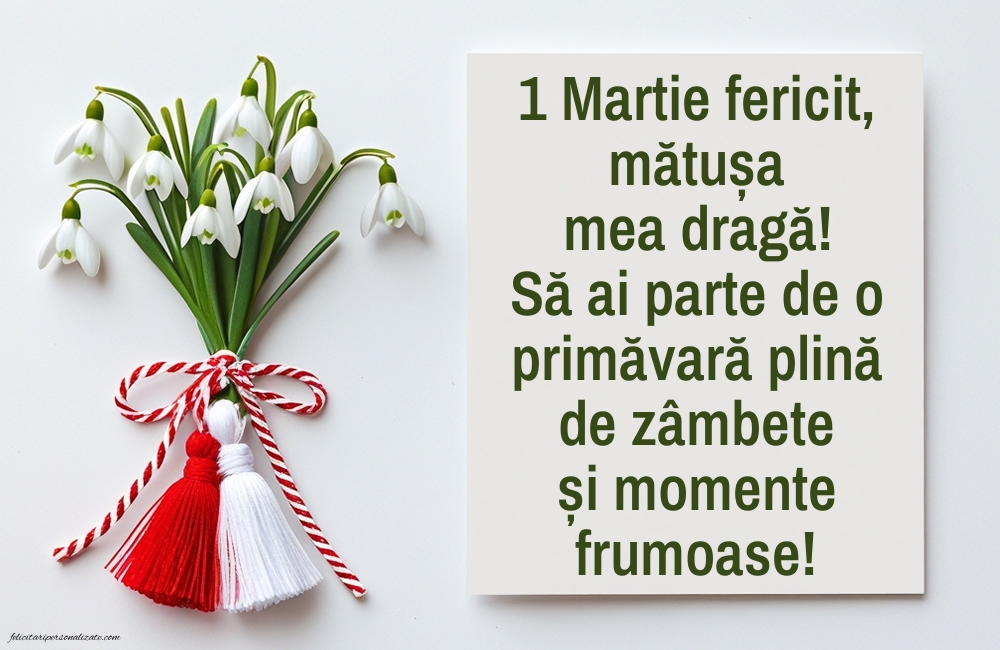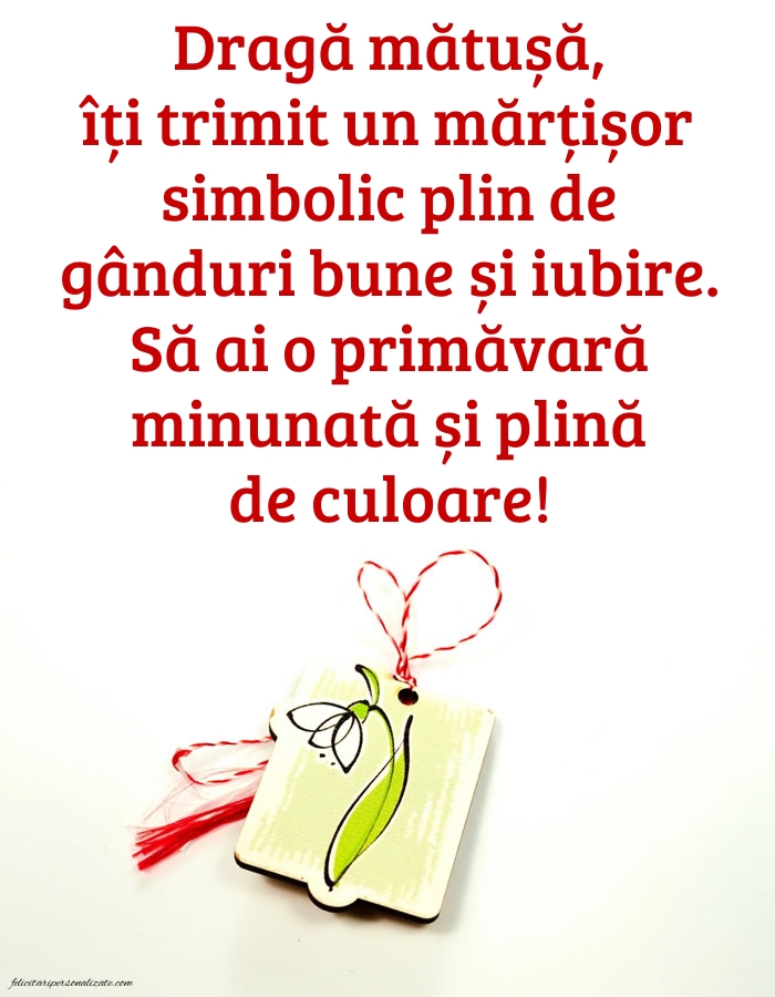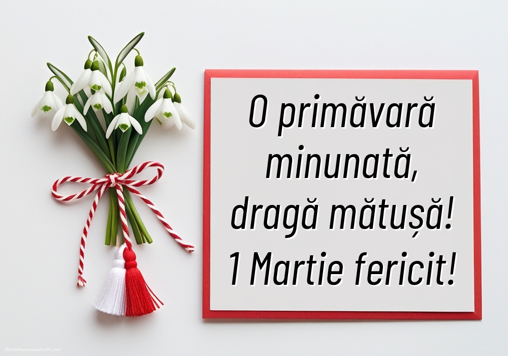 Descoperă cele mai frumoase imagini cu felicitări de 1 Martie pentru mătușă ⭐, perfecte pentru a transmite apreciere, dragoste și gânduri calde de primăvară. Aici găsești poze cu Mărțișor, felicitări cu mesaje frumoase și imagini potrivite pentru a fi trimise online sau oferite personal. Imaginile de 1 Martie pentru mătușă sunt ideale pentru a exprima recunoștința pentru sprijinul, grija și apropierea din familie, aducând bucurie și emoție la începutul primăverii.