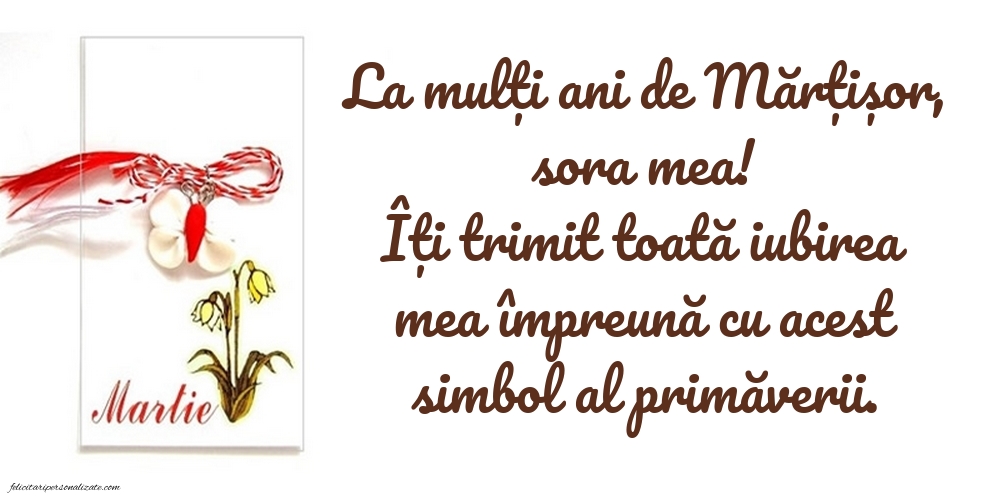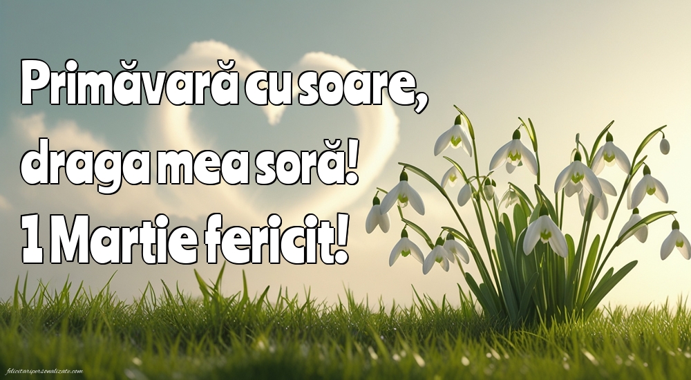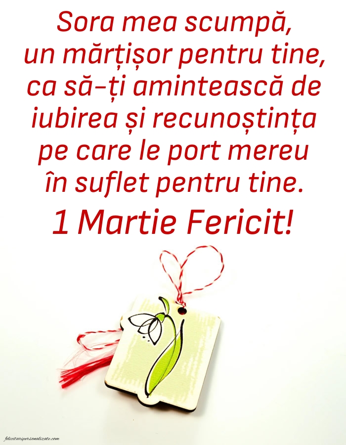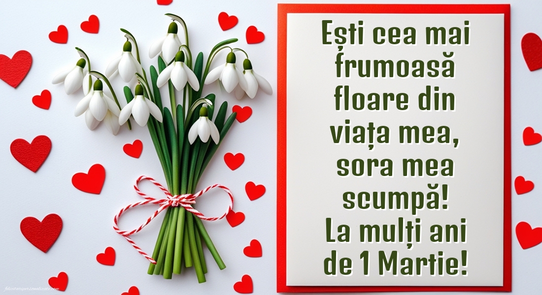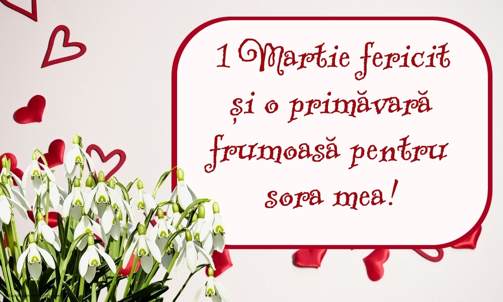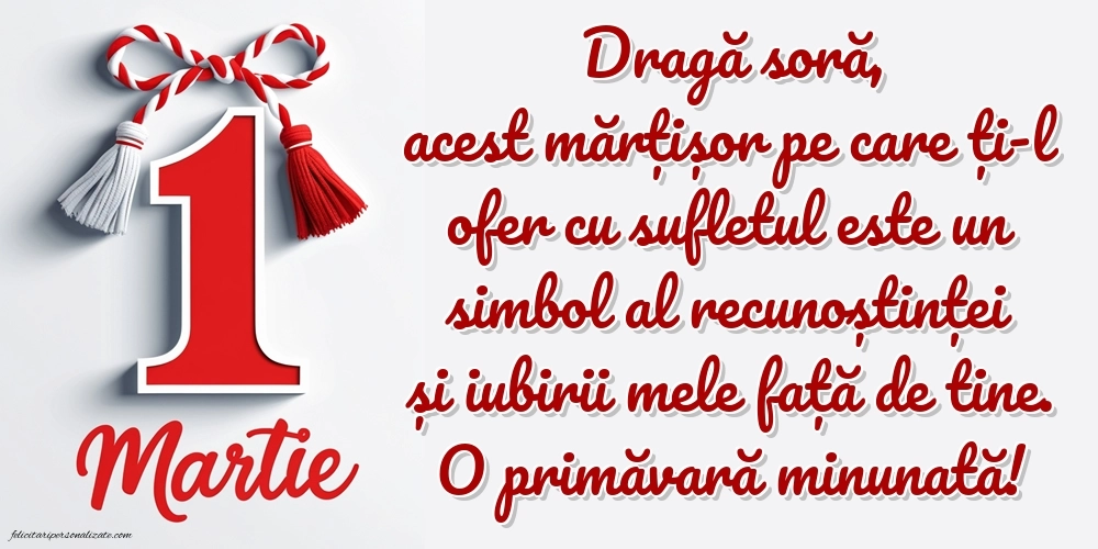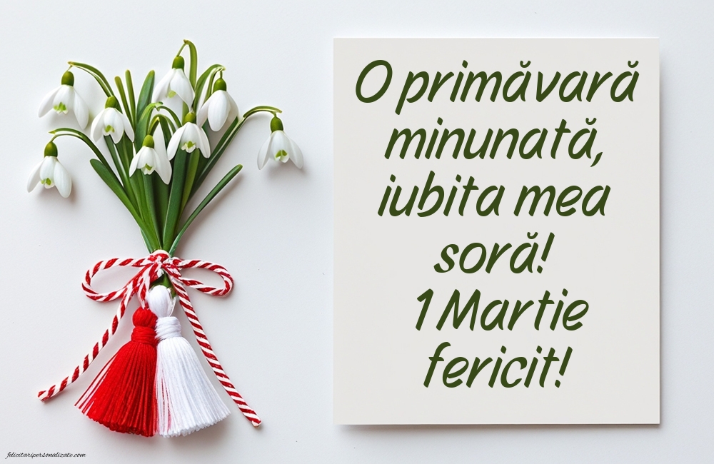 Descoperă cele mai frumoase imagini cu felicitări de 1 Martie pentru sora ta ⭐, perfecte pentru a-i transmite dragoste, bucurie și gânduri de primăvară. Aici găsești poze cu Mărțișor, felicitări cu mesaje speciale și imagini potrivite pentru Facebook, WhatsApp sau alte rețele sociale. Imaginile de 1 Martie pentru soră sunt ideale pentru a-i arăta cât de importantă este pentru tine și pentru a-i face ziua mai frumoasă la început de primăvară.