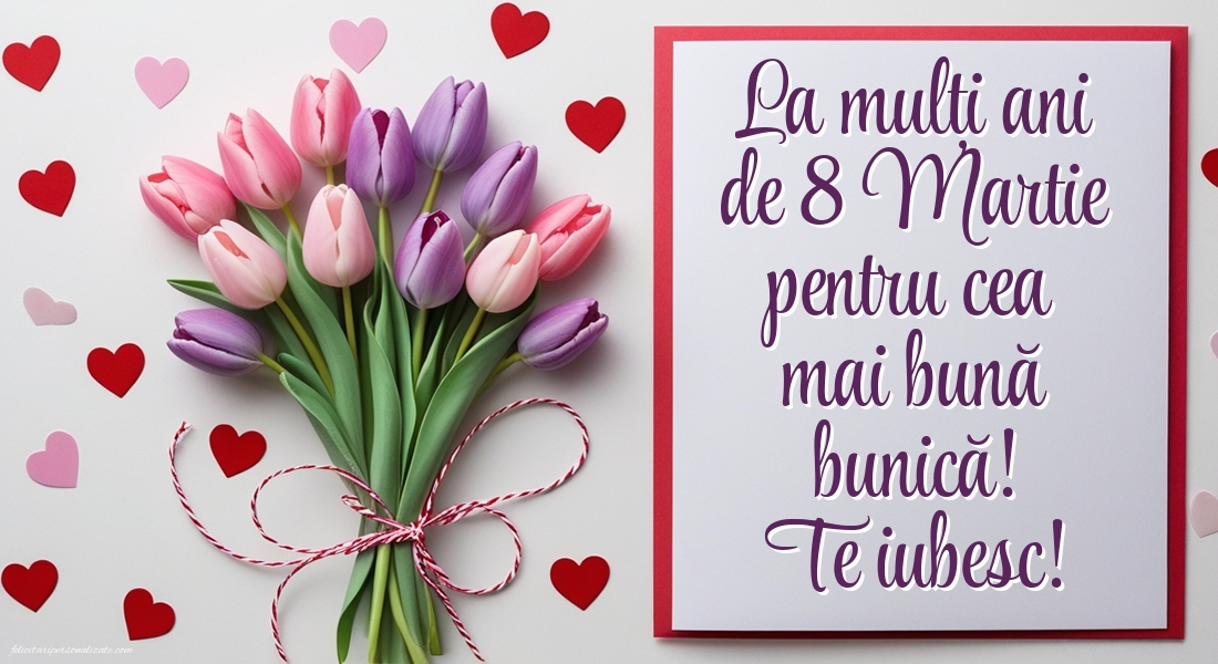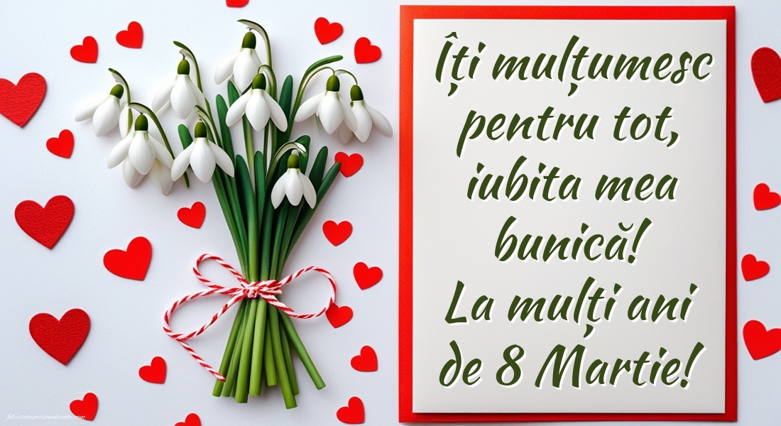 Bunicile ocupă un loc special în inimile noastre, iar 8 Martie – Ziua Femeii este o ocazie perfectă pentru a le arăta cât de mult le iubim și le apreciem. Un gest simplu, dar plin de emoție, este trimiterea unor imagini de 8 Martie pentru bunică, însoțite de urări frumoase și gânduri calde. Pe această pagină vei găsi o colecție de poze și felicitări de 8 Martie pentru bunica, ideale pentru a fi trimise pe WhatsApp, Facebook sau prin mesaj. Imaginile sunt decorate cu flori de primăvară, lalele, ghiocei sau trandafiri și conțin mesaje pline de iubire și recunoștință. Aceste imagini cu urări de Ziua Femeii pentru bunică sunt perfecte pentru a-i transmite un „La mulți ani” sincer și pentru a-i face ziua mai frumoasă. Fie că alegi o felicitare emoționantă, una elegantă sau una simplă și caldă, bunica ta va simți cu siguranță dragostea și aprecierea ta. Alege cele mai frumoase imagini de 8 Martie pentru bunica și trimite-i un mesaj special în această zi dedicată tuturor femeilor.