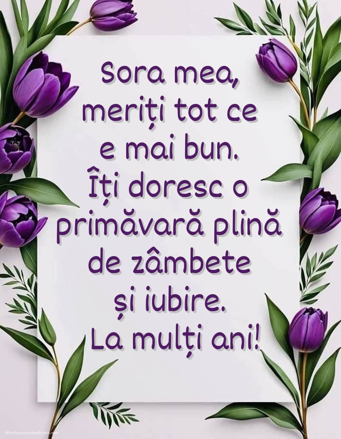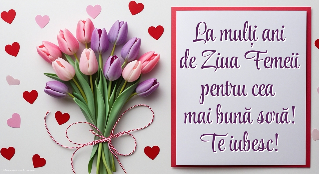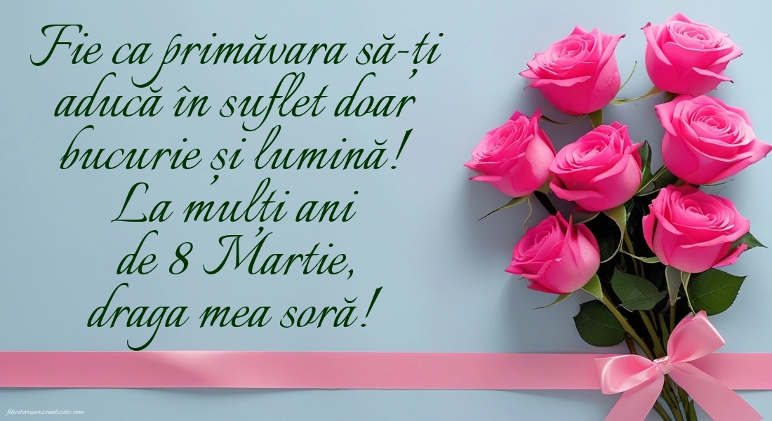 Descoperă cele mai frumoase imagini de 8 Martie pentru soră ⭐, perfecte pentru a transmite dragoste, apreciere și gânduri calde de Ziua Femeii. Aici găsești poze elegante, felicitări cu mesaje emoționante și imagini potrivite pentru a fi trimise online sau oferite personal. Imaginile de 8 Martie pentru soră sunt ideale pentru a exprima afecțiunea, bucuria și legătura specială dintre frați, aducând zâmbete și emoție într-o zi dedicată femeilor.