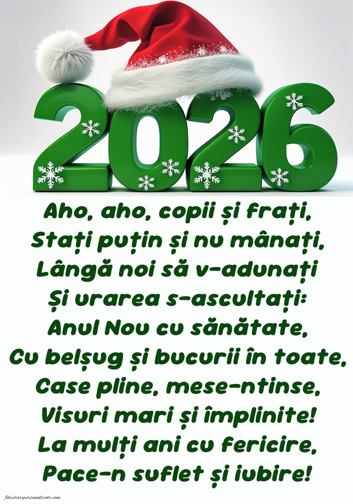 Aho, aho, copii și frați, Stați puțin și nu mânați, Lângă noi să v-adunați Și urarea s-ascultați: Anul Nou cu sănătate, Cu belșug și bucurii în toate, Case pline, mese-ntinse, Visuri mari și împlinite! La mulți ani cu fericire, Pace-n suflet și iubire!