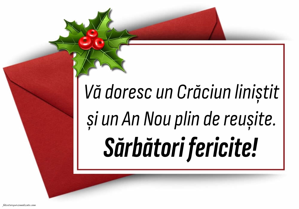 Vă doresc un Crăciun liniștit și un An Nou plin de reușite. Sărbători fericite!