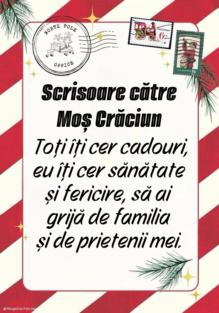 Scrisoare către Moș Crăciun Toți îți cer cadouri, eu îți cer sănătate și fericire, să ai grijă de familia și de prietenii mei.
