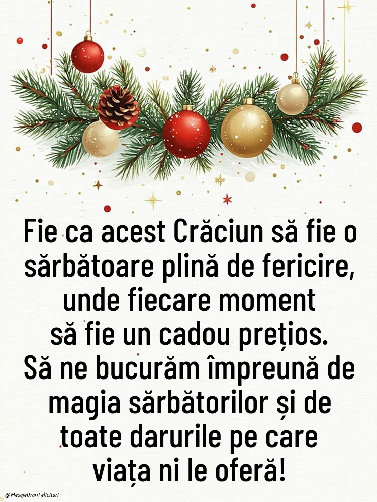 Fie ca acest Crăciun să fie o sărbătoare plină de fericire, unde fiecare moment să fie un cadou prețios. Să ne bucurăm împreună de magia sărbătorilor și de toate darurile pe care viața ni le oferă!