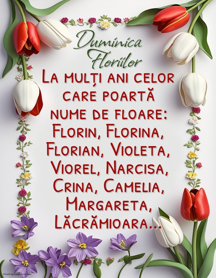 La mulți ani tuturor celor care poartă nume de floare: Florin, Florina, Florian, Violeta, Viorel, Narcisa, Crina, Camelia, Margareta și Lăcrămioara!