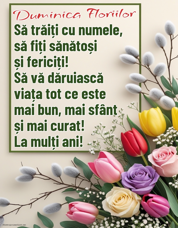 Duminica FloriilorSă trăiți cu numele, să fiți sănătoși și fericiți! Să vă dăruiască viața tot ce este mai bun, mai sfânt și mai curat! La mulți ani!