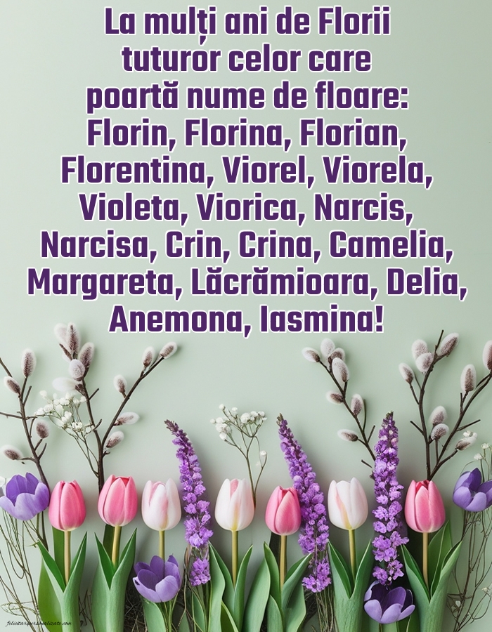 La mulți ani de Florii tuturor celor care poartă nume de floare: Florin, Florina, Florian, Florentina, Viorel, Viorela, Violeta, Viorica, Narcis, Narcisa, Crin, Crina, Camelia, Margareta, Lăcrămioara, Delia, Anemona, Iasmina!