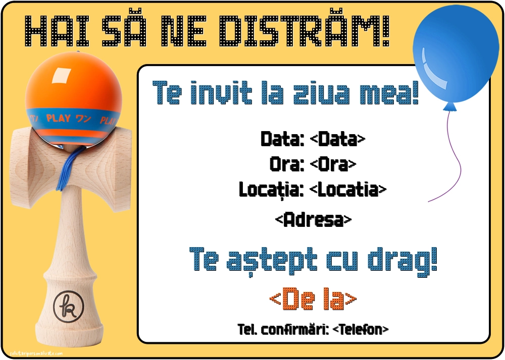 Se apropie ziua copilului tău și nu știi cum să-i inviți prietenii la petrecere într-un mod original? În mai putin de două minute poți să personalizezi online această invitație pentru copii cu Kendama cu un balon albastru. Așa, invitația o rezolvi rapid și câștigi timp pentru organizarea petrecerii!