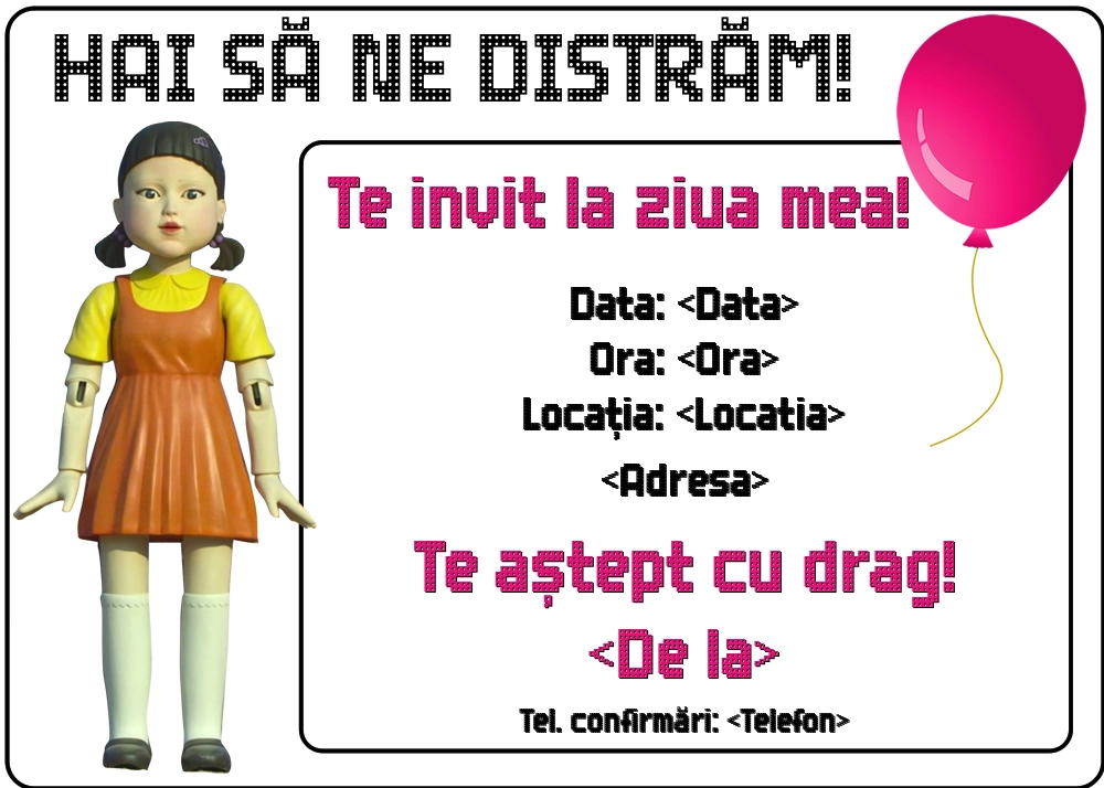 Se apropie ziua copilului tău și nu știi cum să-i inviți prietenii la petrecere într-un mod original? În mai putin de două minute poți să personalizezi online această invitație pentru copii cu Squid Game doll. Așa, invitația o rezolvi rapid și câștigi timp pentru organizarea petrecerii!