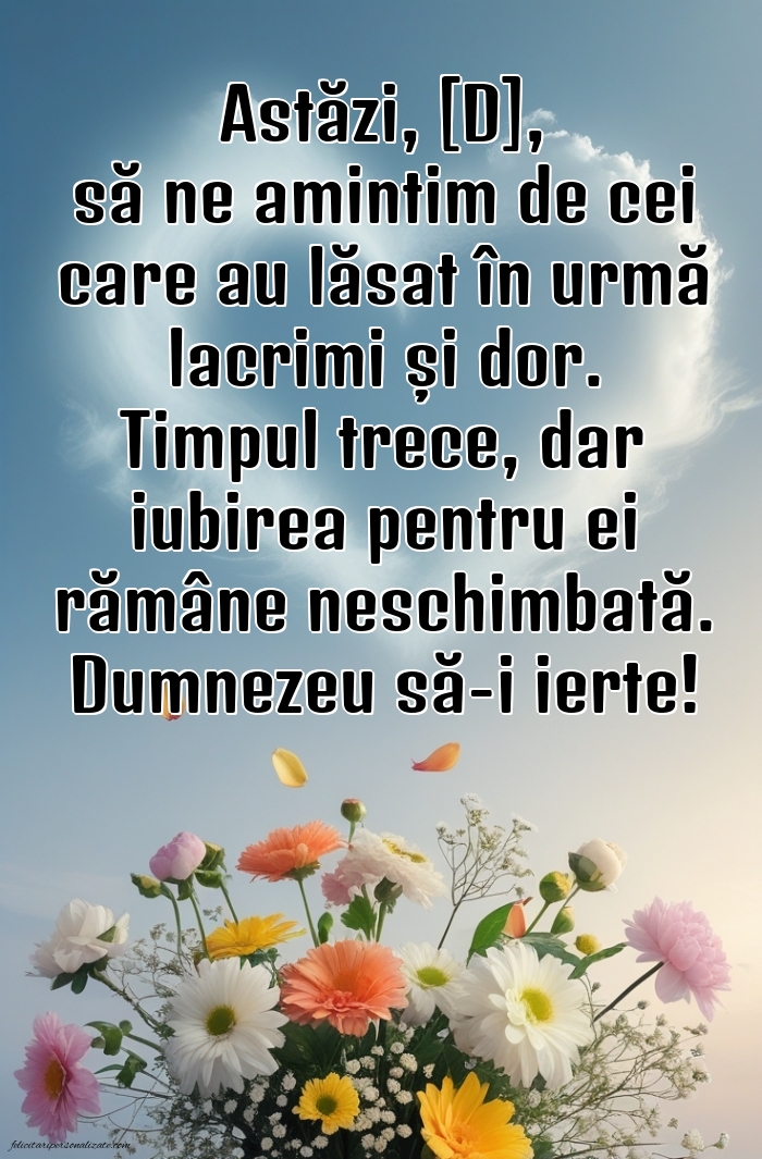 Astăzi, [D], să ne amintim de cei care au lăsat în urmă lacrimi și dor. Timpul trece, dar iubirea pentru ei rămâne neschimbată. Dumnezeu să-i ierte!