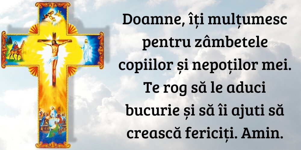 Doamne, îți mulțumesc pentru zâmbetele copiilor și nepoților mei. Te rog să le aduci bucurie și să îi ajuti să crească fericiți. Amin.