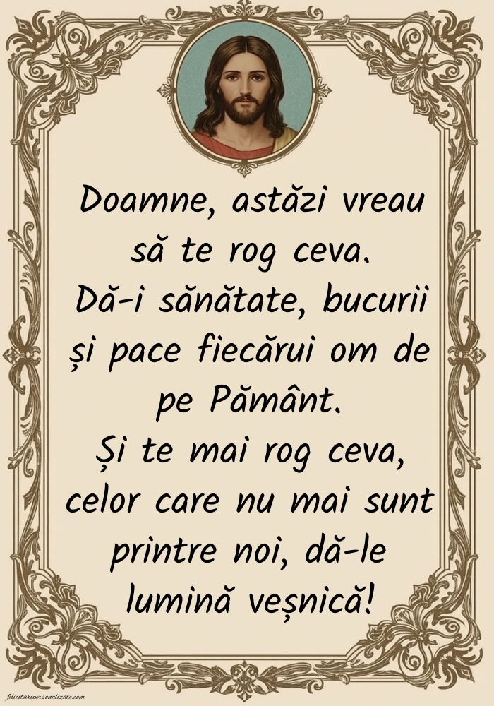 Doamne, astăzi vreau să te rog ceva. Dă-i sănătate, bucurii și pace fiecărui om de pe Pământ. Și te mai rog ceva, celor care nu mai sunt printre noi, dă-le lumină veșnică!