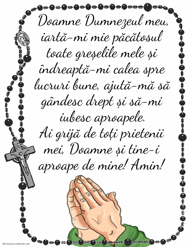 Doamne Dumnezeul meu, iartă-mi mie păcătosul toate greșelile mele și îndreaptă-mi calea spre lucruri bune, ajută-mă să gândesc drept și să-mi iubesc aproapele. Ai grijă de toți prietenii mei, Doamne și tine-i aproape de mine! Amin!