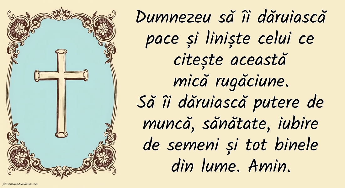 Dumnezeu să îi dăruiască pace și liniște celui ce citește această mică rugăciune. Să îi dăruiască putere de muncă, sănătate, iubire de semeni și tot binele din lume. Amin.