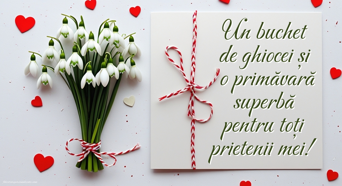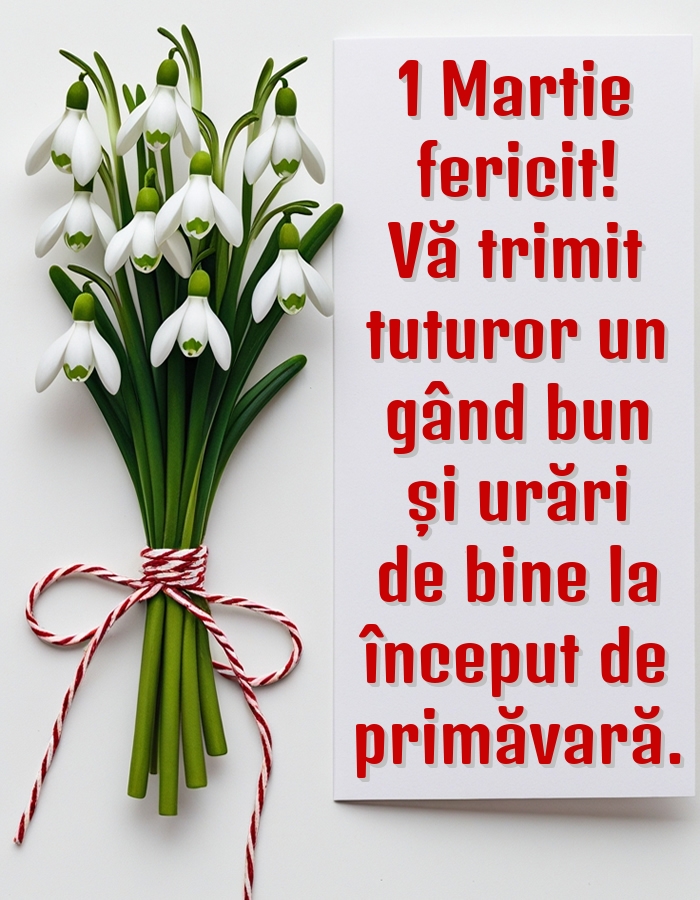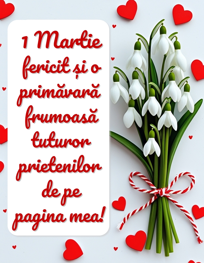 Iată 1 Martie a sosit! Ghiocelul floare mândră, Vestitor de primăvară, Să vă aducă numai bine, Dragoste și fericire! O primăvară frumoasă!