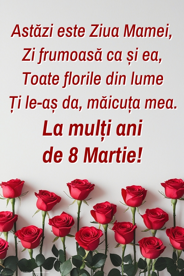Astăzi este Ziua Mamei, Zi frumoasă ca și ea, Toate florile din lume Ți le-aș da, măicuța mea. La mulți ani de 8 Martie!