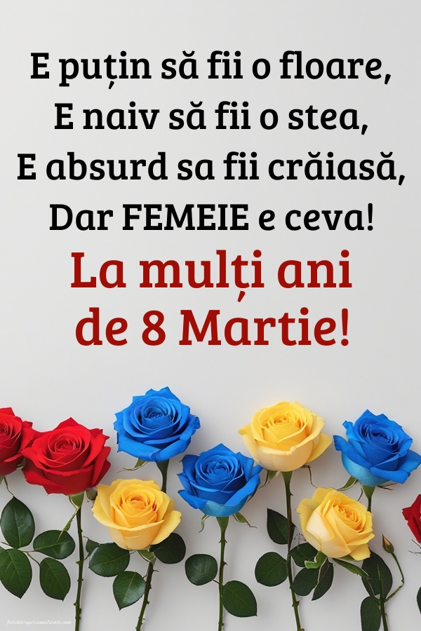 E puțin să fii o floare, E naiv să fii o stea, E absurd sa fii crăiasă, Dar FEMEIE e ceva! La mulți ani de 8 martie!