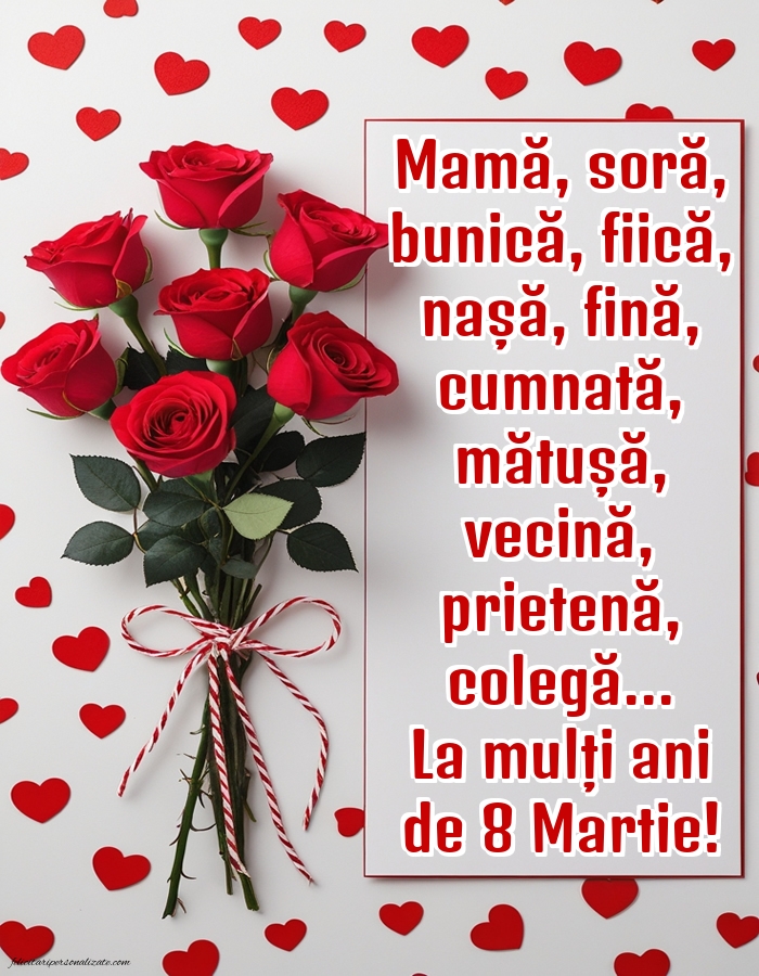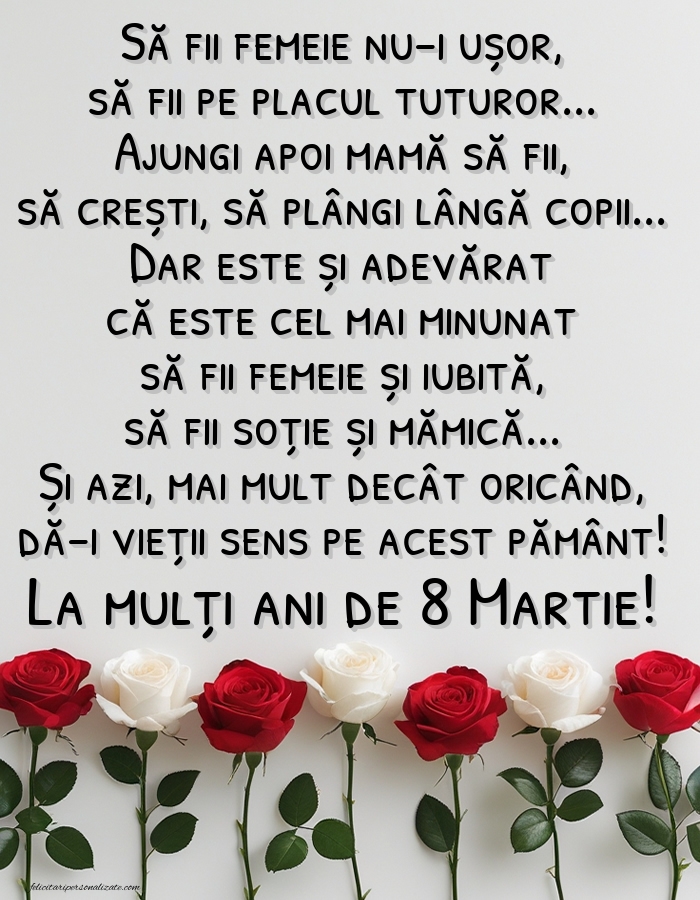 Să fii femeie nu-i ușor, să fii pe placul tuturor... Ajungi apoi mamă să fii, să crești, să plângi lângă copii... Dar este și adevărat că este cel mai minunat să fii femeie și iubită, să fii soție și mămică... Și azi, mai mult decât oricând, dă-i vieții sens pe acest pământ! La mulți ani de 8 Martie!