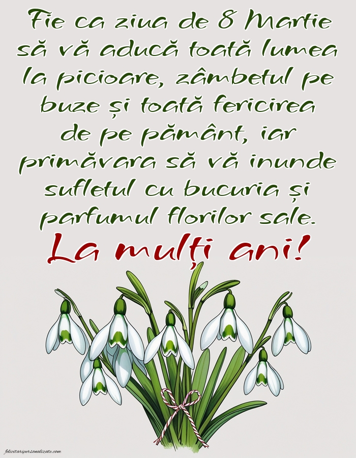 Fie ca ziua de 8 Martie să vă aducă toată lumea la picioare, zâmbetul pe buze și toată fericirea de pe pământ, iar primăvara să vă inunde sufletul cu bucuria și parfumul florilor sale. La mulți ani!