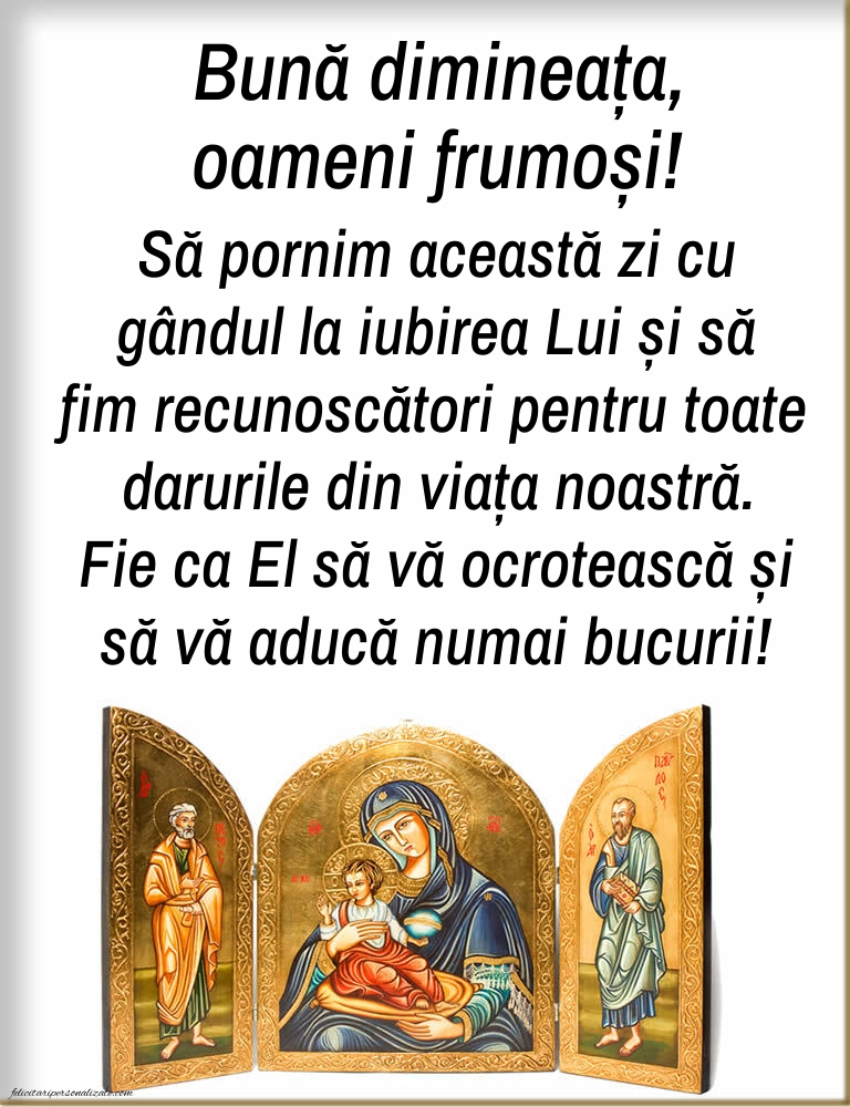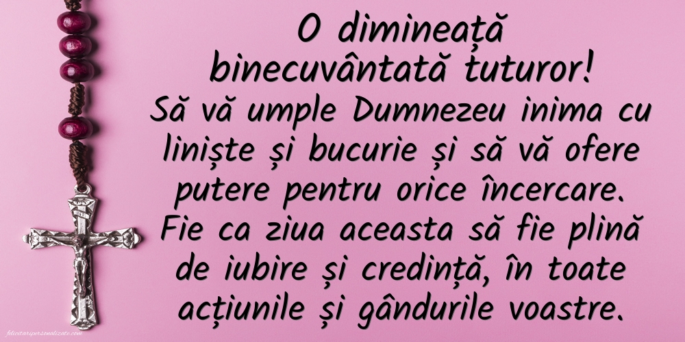 O dimineață binecuvântată tuturor! Să vă umple Dumnezeu inima cu liniște și bucurie și să vă ofere putere pentru orice încercare. Fie ca ziua aceasta să fie plină de iubire și credință, în toate acțiunile și gândurile voastre.