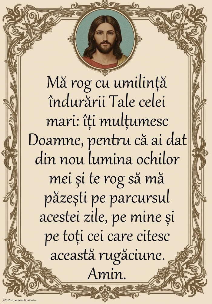 Mă rog cu umilință îndurării Tale celei mari: îți mulțumesc Doamne, pentru că ai dat din nou lumina ochilor mei și te rog să mă păzești pe parcursul acestei zile, pe mine și pe toți cei care citesc această rugăciune. Amin.