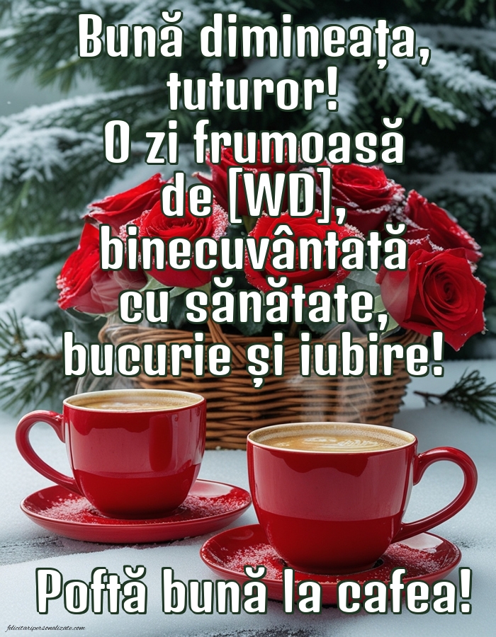 Bună dimineața, tuturor! O zi frumoasă de [WD], binecuvântată cu sănătate, bucurie și iubire! Poftă bună la cafea!