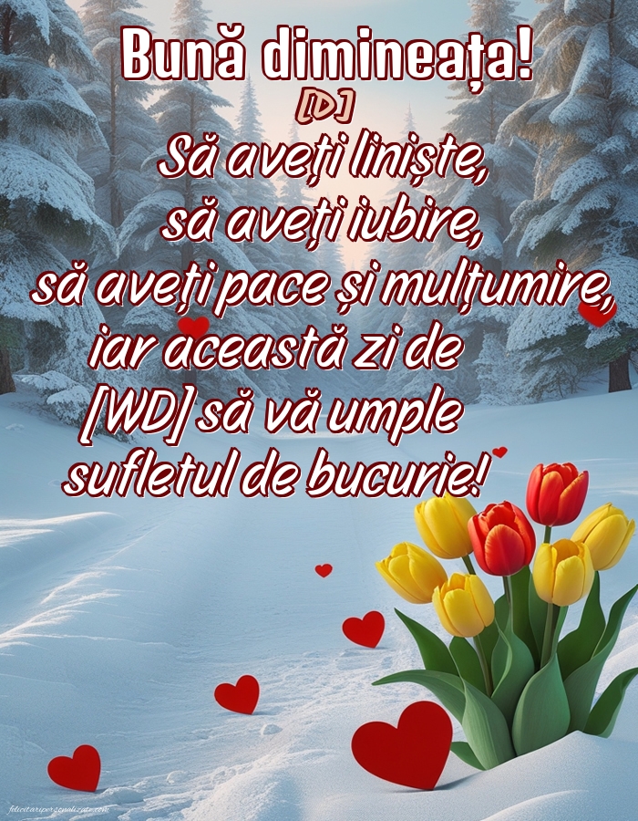 Bună dimineața! [D] Să aveți liniște, să aveți iubire, să aveți pace și mulțumire, iar această zi de [WD] să vă umple sufletul de bucurie!