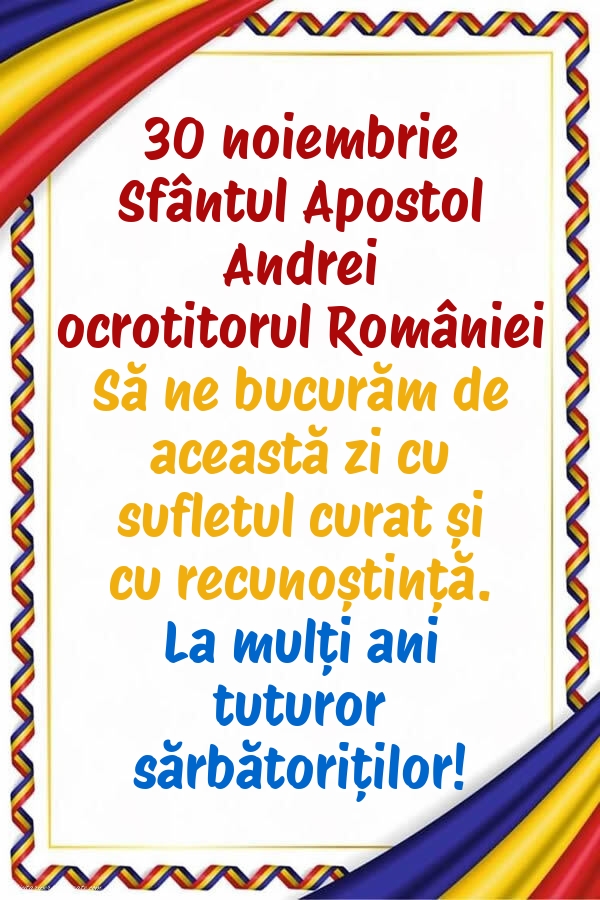 30 noiembrie – Sfântul Apostol Andrei, ocrotitorul României. Să ne bucurăm de această zi cu sufletul curat și cu recunoștință. La mulți ani tuturor sărbătoriților!