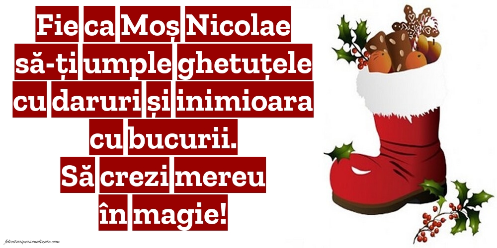 Fie ca Moș Nicolae să-ți umple ghetuțele cu daruri și inimioara cu bucurii. Să crezi mereu în magie!