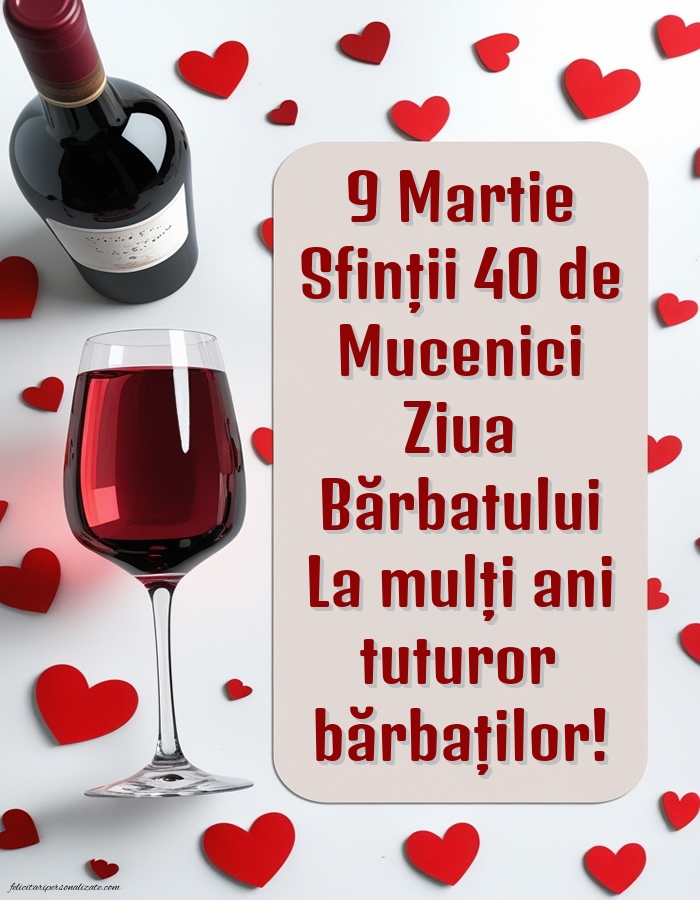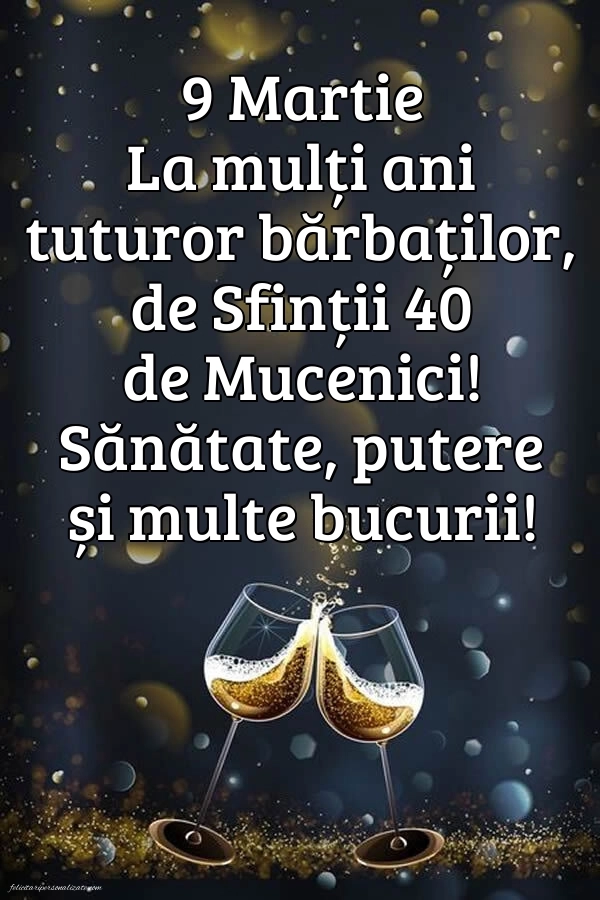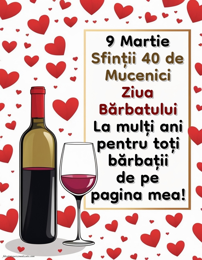 9 Martie este o zi importantă în tradiția românească, când sunt sărbătoriți Sfinții 40 de Mucenici, iar în mod simbolic este celebrată și Ziua Bărbaților. Cu această ocazie, multe persoane aleg să transmită gânduri bune și urări speciale celor dragi prin mesaje sau imagini postate pe rețelele sociale. Pe această pagină vei găsi o colecție de imagini de 9 Martie pentru Facebook, perfecte pentru a transmite felicitări, mesaje și urări inspirate de această sărbătoare. Imaginile pot fi trimise prietenilor, colegilor, soțului, tatălui sau altor bărbați importanți din viața ta.