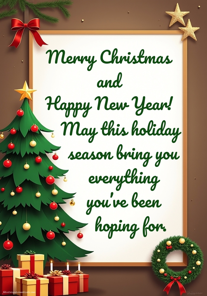 Merry Christmas and Happy New Year! May this holiday season bring you everything you’ve been hoping for. (Crăciun fericit și un An Nou fericit! Fie ca acest sezon de sărbători să-ți aducă tot ce ai sperat.)