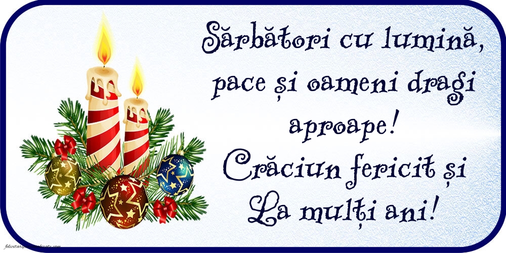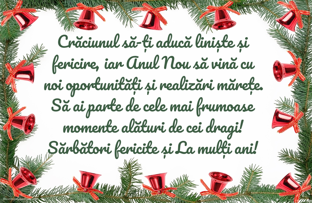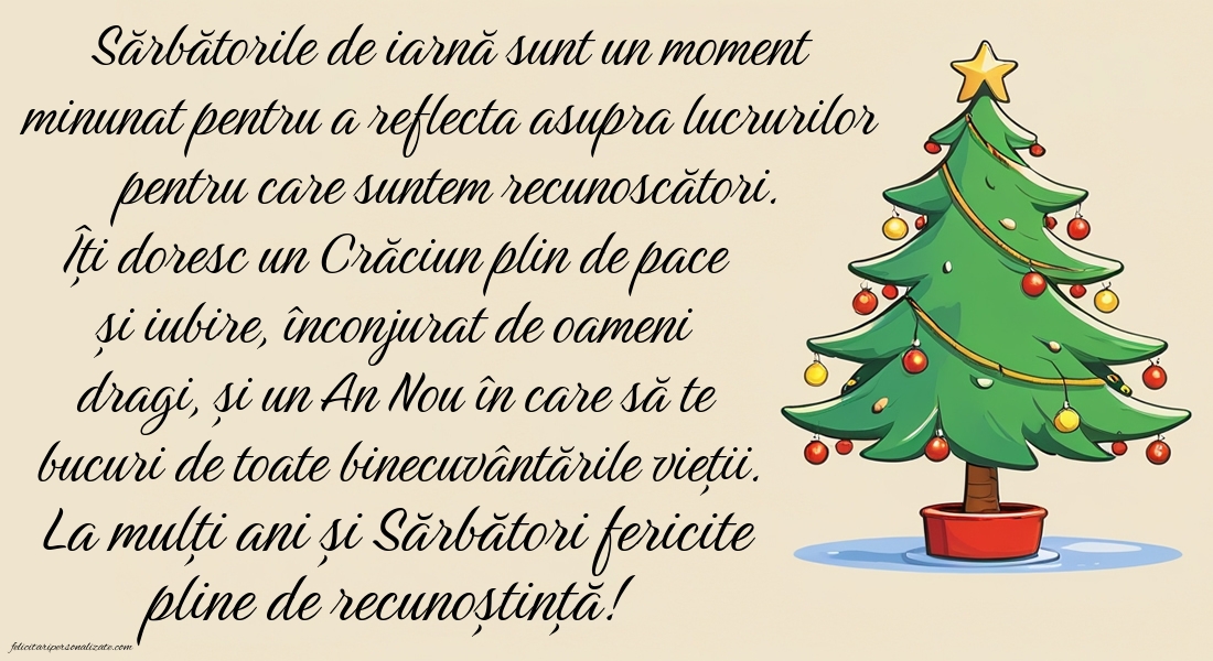 Sărbătorile de iarnă sunt un moment minunat pentru a reflecta asupra lucrurilor pentru care suntem recunoscători. Îți doresc un Crăciun plin de pace și iubire, înconjurat de oameni dragi, și un An Nou în care să te bucuri de toate binecuvântările vieții. La mulți ani și Sărbători fericite pline de recunoștință!