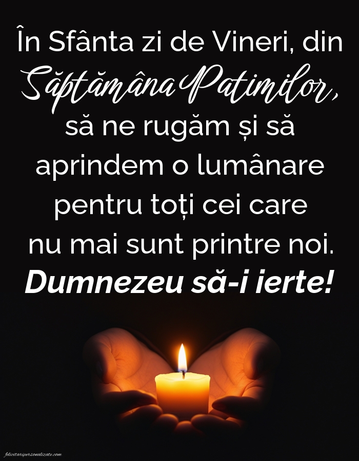 În Sfânta zi de Vineri, din Săptămâna Patimilor, să ne rugăm și să aprindem o lumânare pentru toți cei care nu mai sunt printre noi. Dumnezeu să-i ierte!