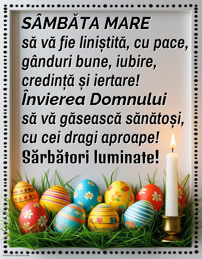 SÂMBĂTA MARE să vă fie liniștită, cu pace, gânduri bune, iubire, credință și iertare! Învierea Domnului să vă găsească sănătoși, cu cei dragi aproape! Sărbători luminate!