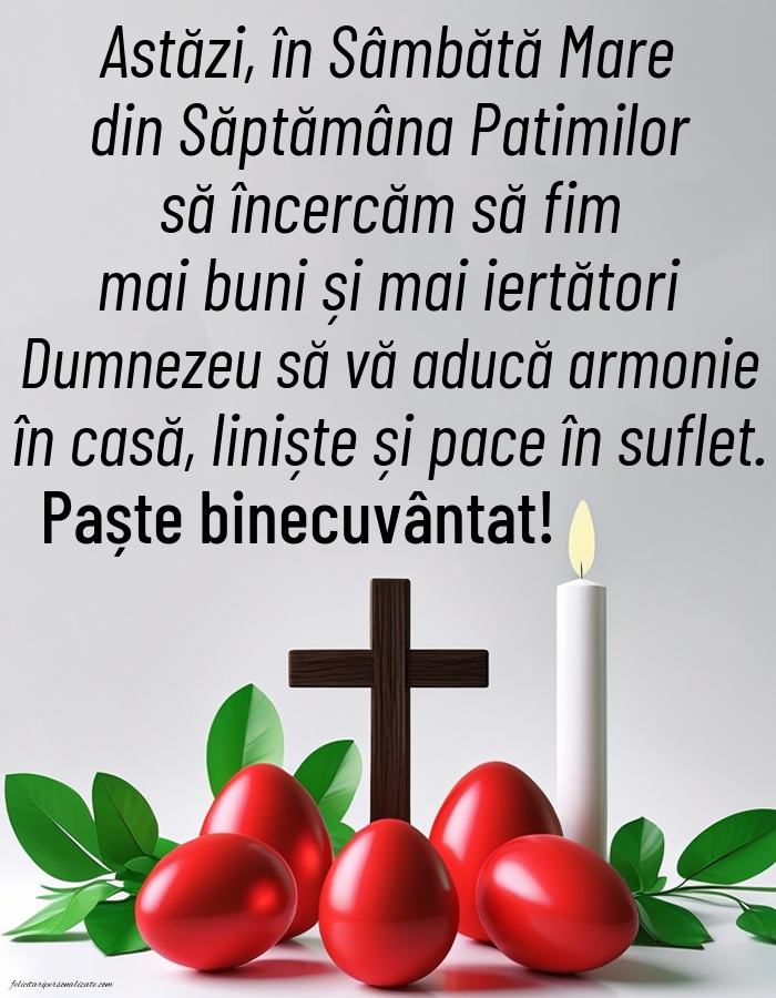 Astăzi, în Sâmbătă Mare din Săptămâna Patimilor, să încercăm să fim mai buni și mai iertători. Dumnezeu să vă aducă armonie în casă, liniște și pace în suflet. Paște binecuvântat!