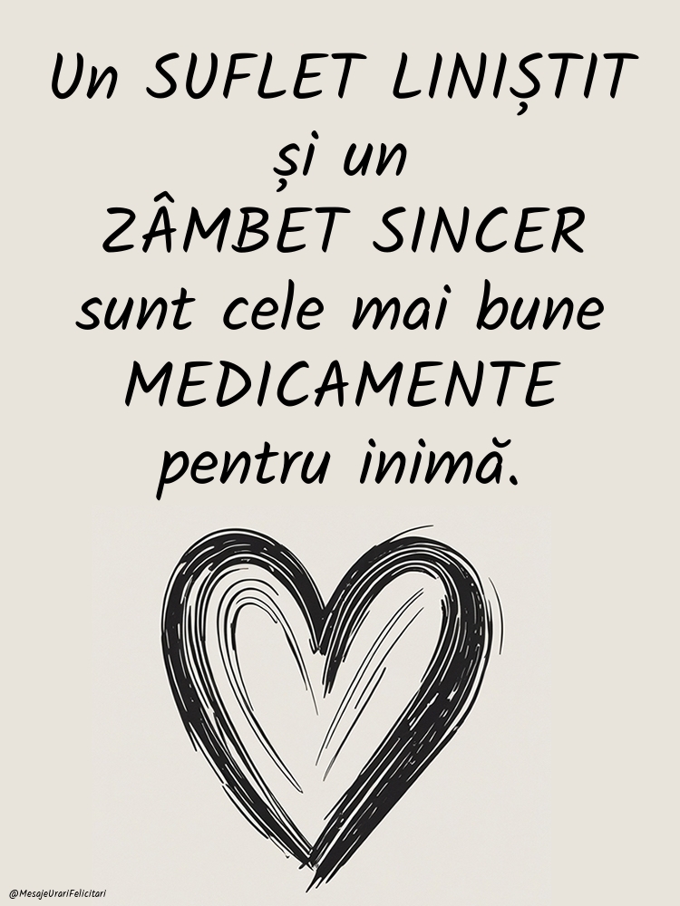 Un SUFLET LINIȘTIT și un ZÂMBET SINCER sunt cele mai bune MEDICAMENTE pentru inimă.