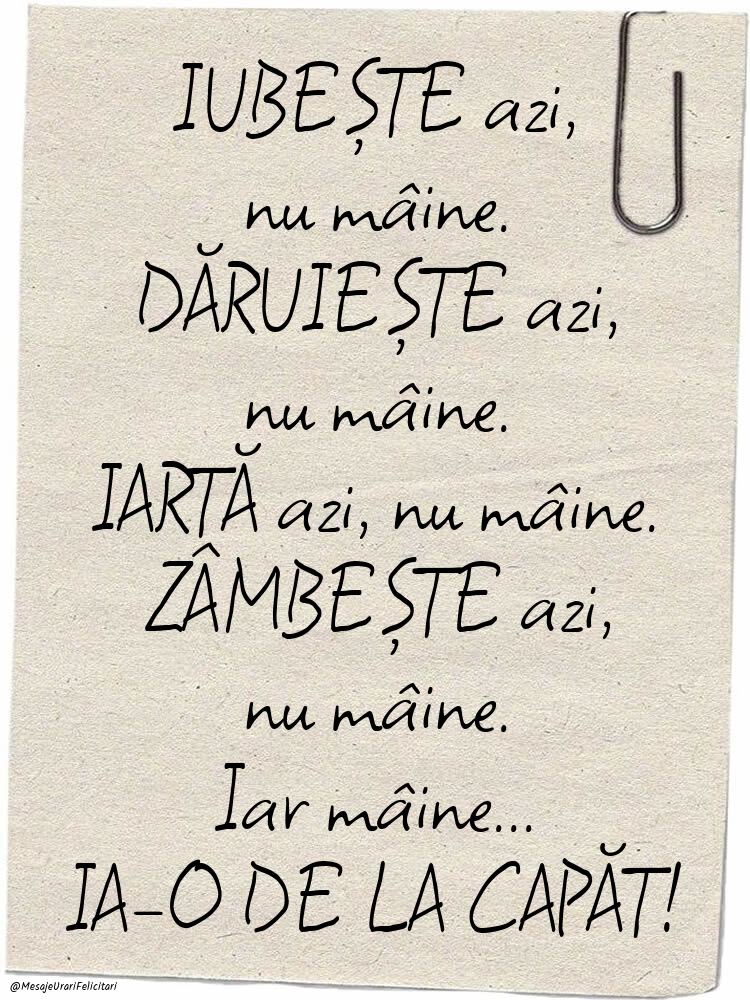 IUBEȘTE azi, nu mâine. DĂRUIEȘTE azi, nu mâine. IARTĂ azi, nu mâine. ZÂMBEȘTE azi, nu mâine. Iar mâine... IA-O DE LA CAPĂT!