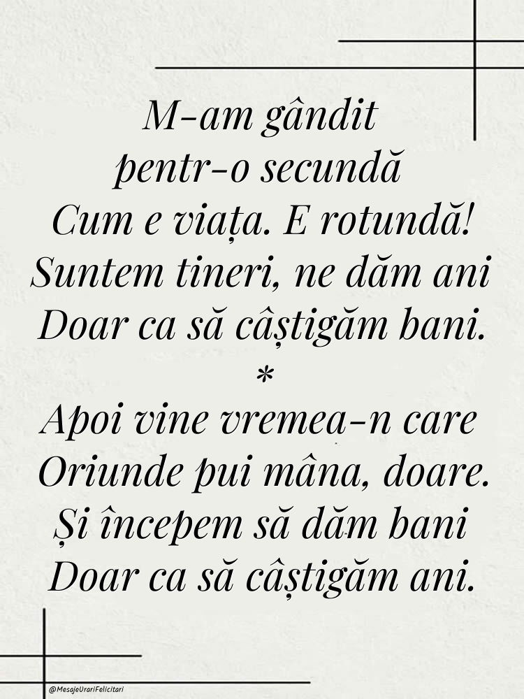 M-am gândit pentr-o secundă Cum e viața. E rotundă! Suntem tineri, ne dăm ani Doar ca să câștigăm bani. Apoi vine vremea-n care Oriunde pui mâna, doare. Și începem să dăm bani Doar ca să câștigăm ani.