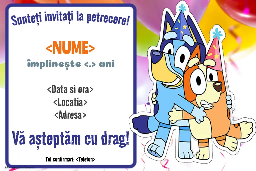Se apropie ziua copilului tău și nu știi cum să-i inviți prietenii la petrecere într-un mod original? În mai putin de două minute poți să personalizezi online această invitație pentru copii cu Bluey și Bingo pe fundal cu baloane. Așa, invitația o rezolvi rapid și câștigi timp pentru organizarea petrecerii!