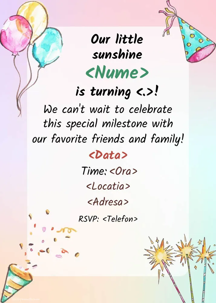 Se apropie ziua copilului tău și nu știi cum să-i inviți prietenii la petrecere într-un mod original? În mai putin de două minute poți să personalizezi online această invitație pentru copii cu baloane, confeti, artificii și text în Engleză. Așa, invitația o rezolvi rapid și câștigi timp pentru organizarea petrecerii!