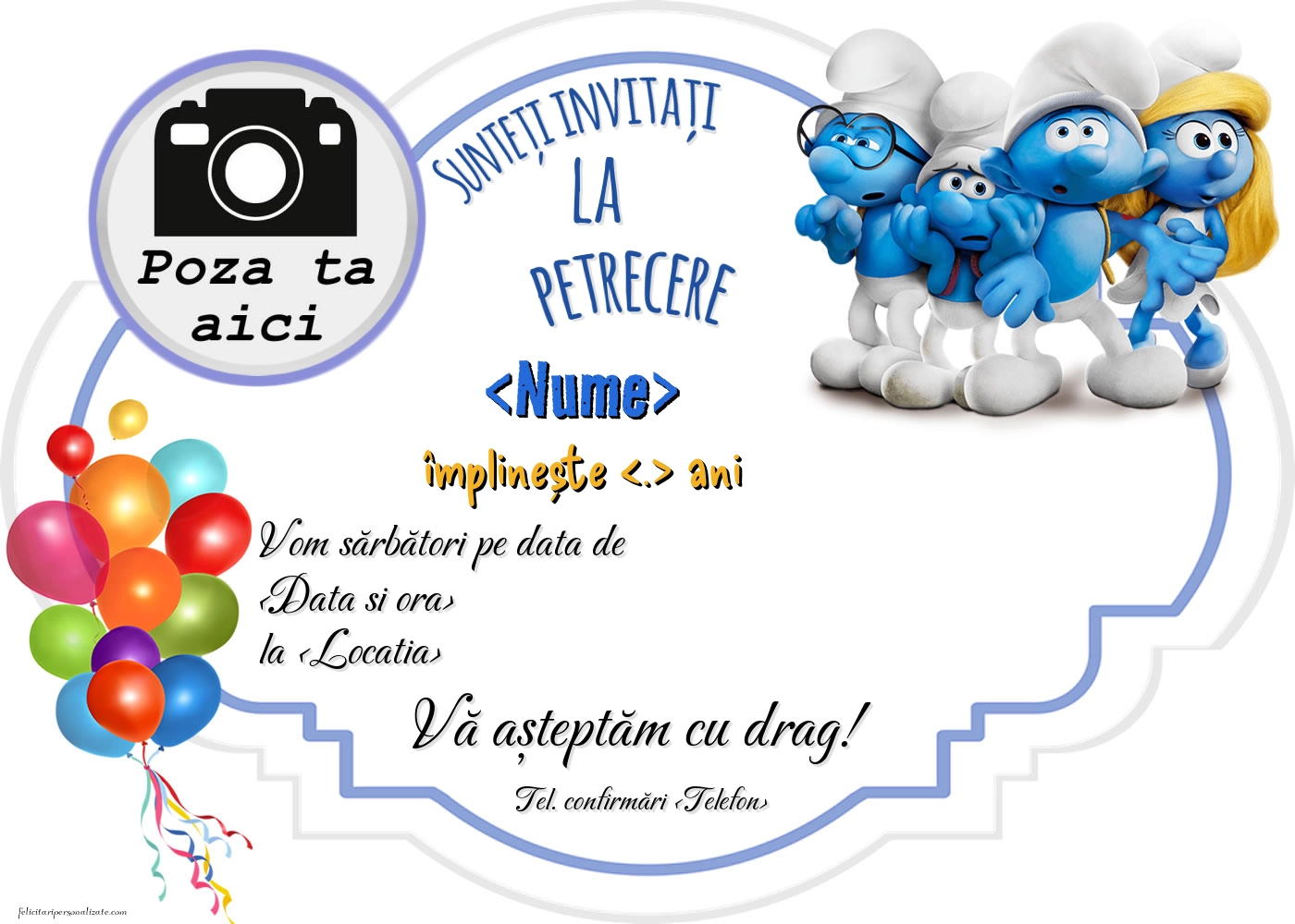 Se apropie ziua copilului tău și nu știi cum să-i inviți prietenii la petrecere într-un mod original? În mai putin de două minute poți să personalizezi online această invitație pentru copii cu Ștrumfi și poza sărbătoritului pentru băieți. Așa, invitația o rezolvi rapid și câștigi timp pentru organizarea petrecerii!